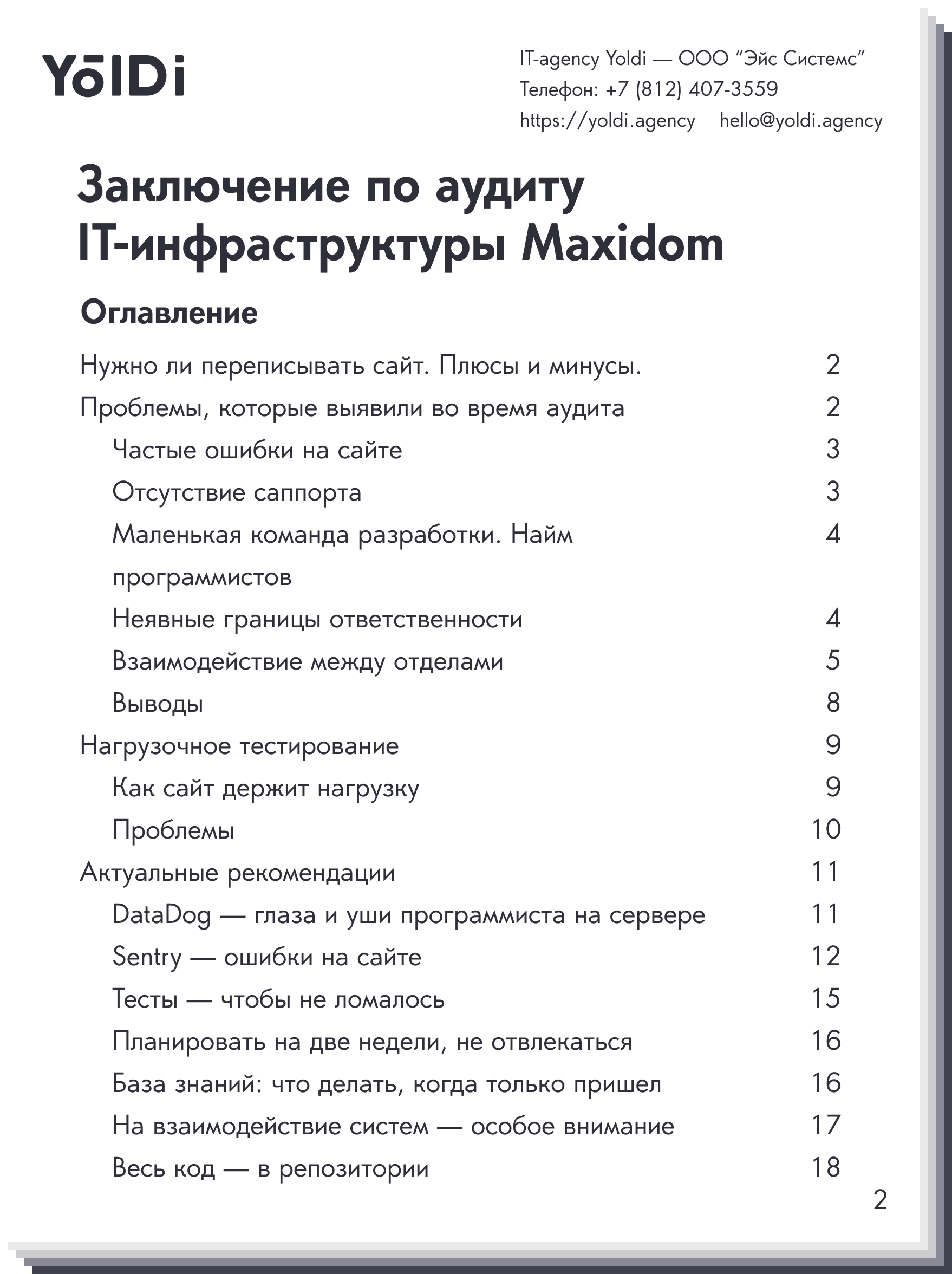 Решили выявить причины проблем, а не локально справиться с симптомами. Поэтому не стали торопиться с предложением обновления сайта или серверов, а решили подробно разобраться в технической экосистеме компании, и в том как работает IT отдел. Мы провели подробный аудит инфраструктуры, сделали нагрузочное тестирование, нашли проблемы в организации работы IT-отдела и подробно расписали, как их устранить.